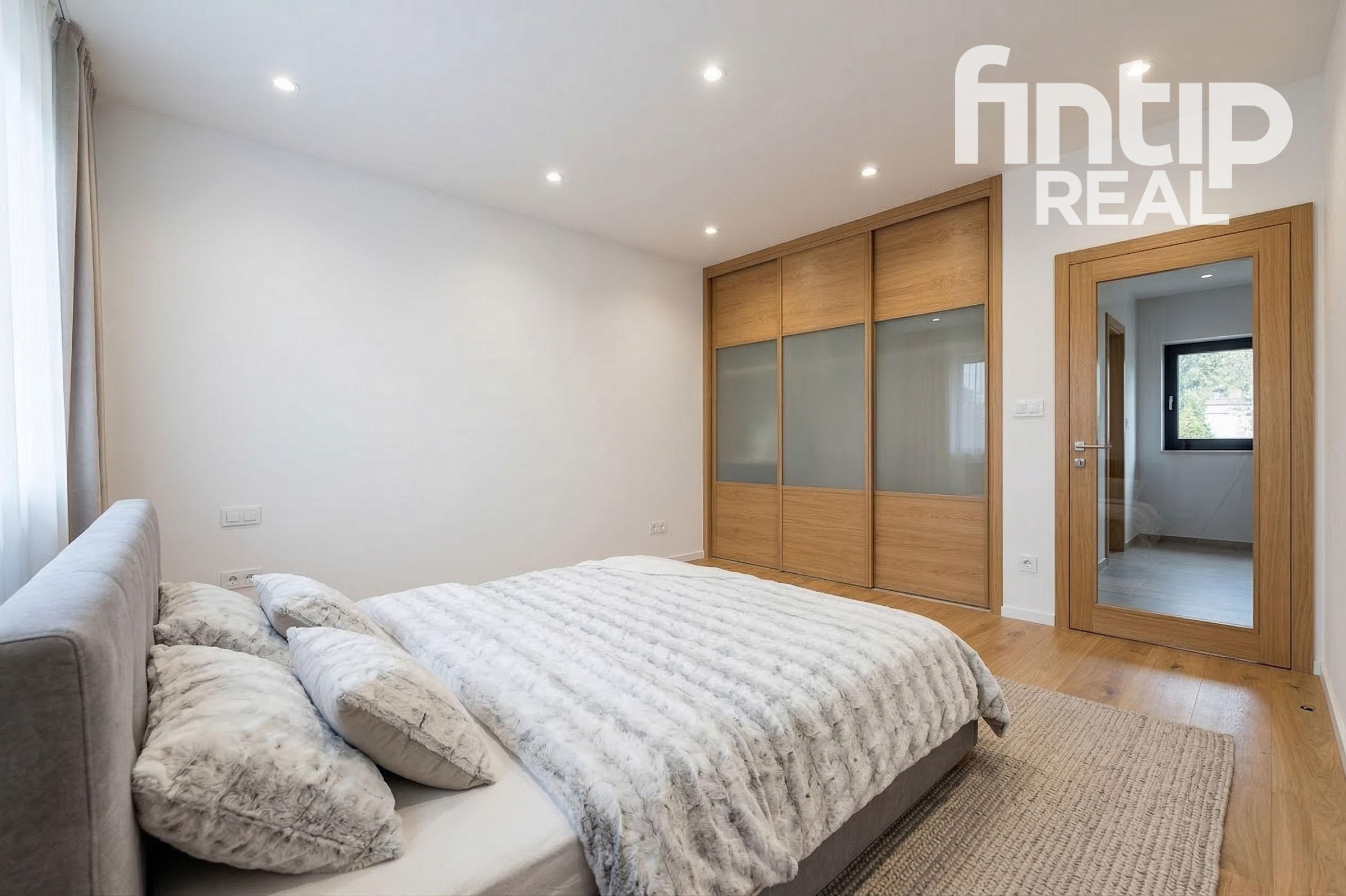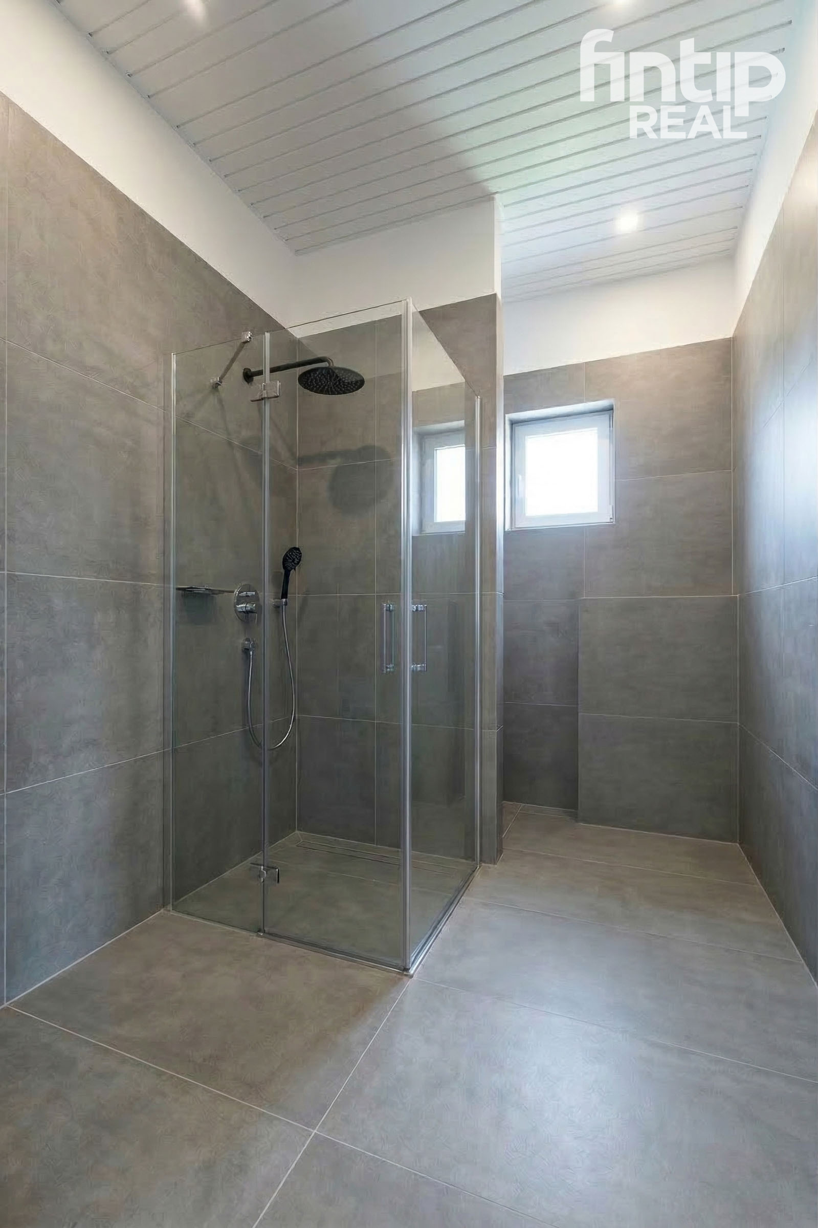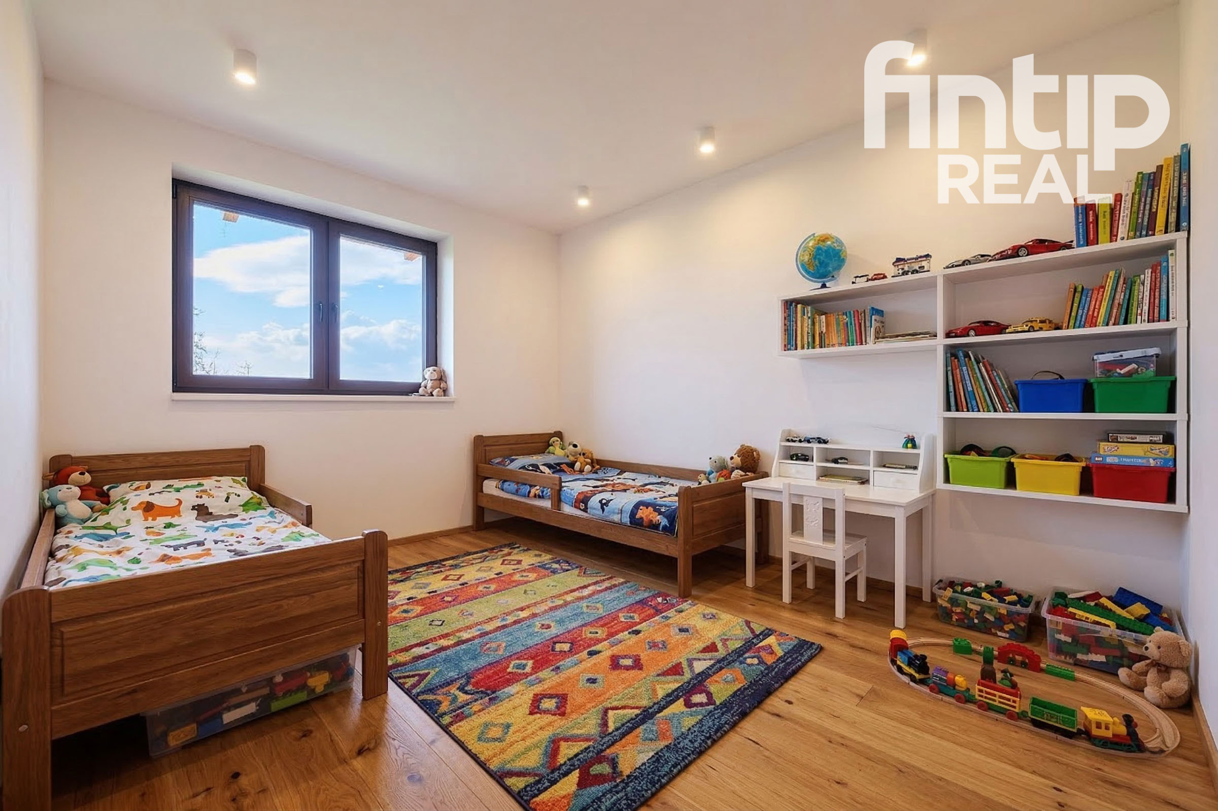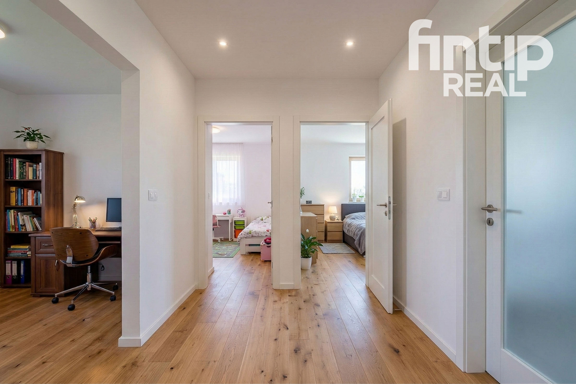 Poschodie: Chodba, dve detské izby, hlavná spálňa s vlastným šatníkom a veľká rodinná kúpeľňa s WC. Horné poschodie je, rovnako ako prízemie, presvetlené vďaka oknám v kúpeľni a pri schodisku.