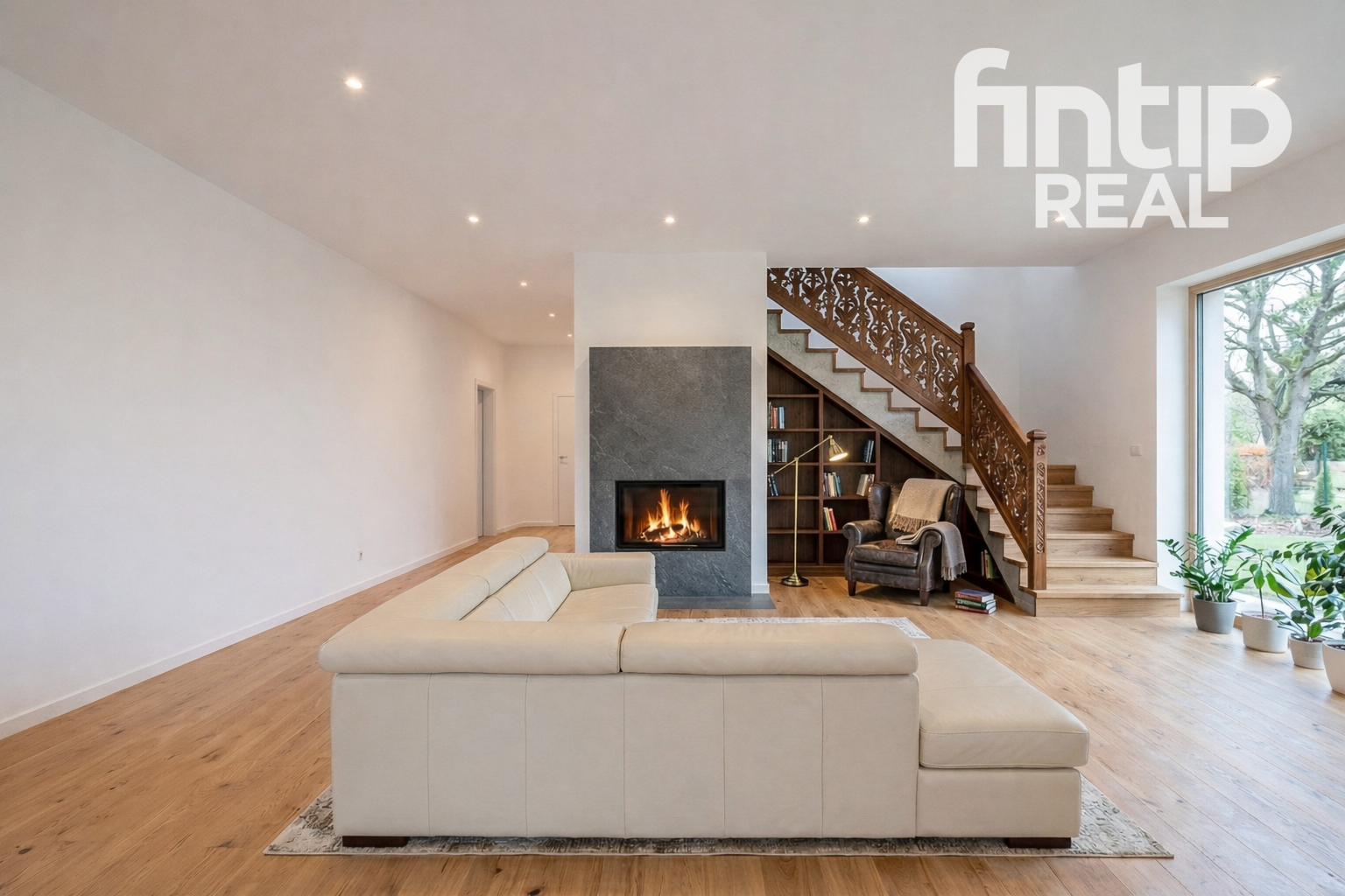 Krb: V obývacej izbe sú navrhnuté krbové kachle s vložkou ABX a komínovým systémom Schiedel UNI Plus.